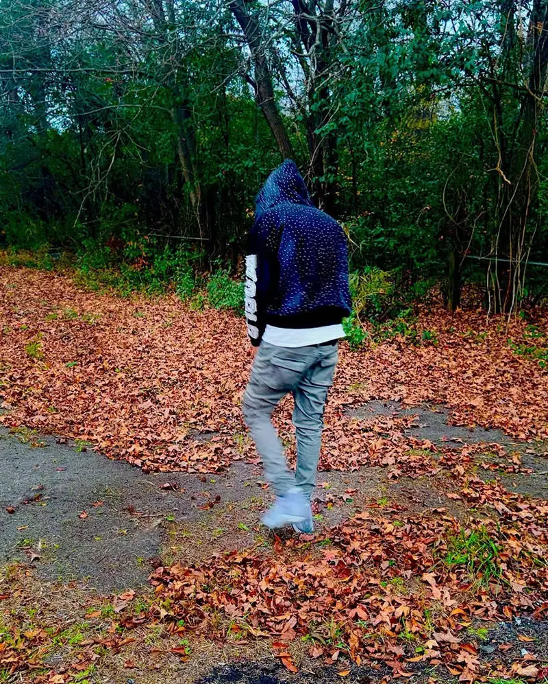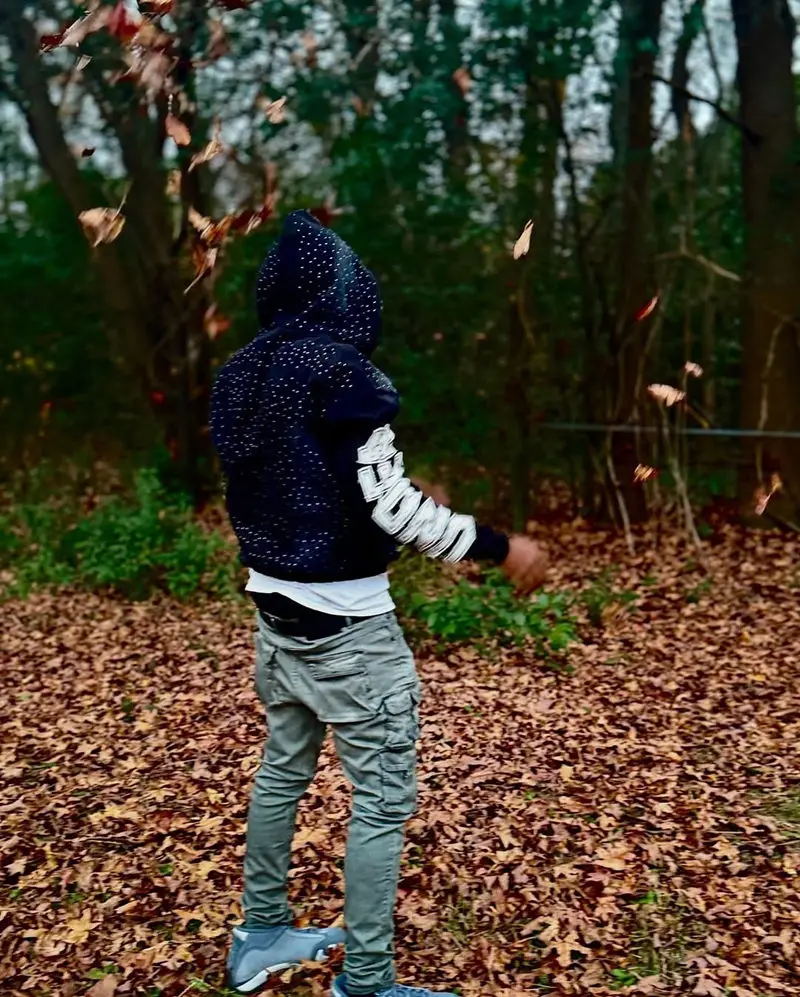Intricate rhinestone prints cover the hoodie, adding a shimmering, luxurious touch.