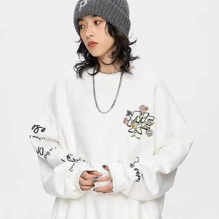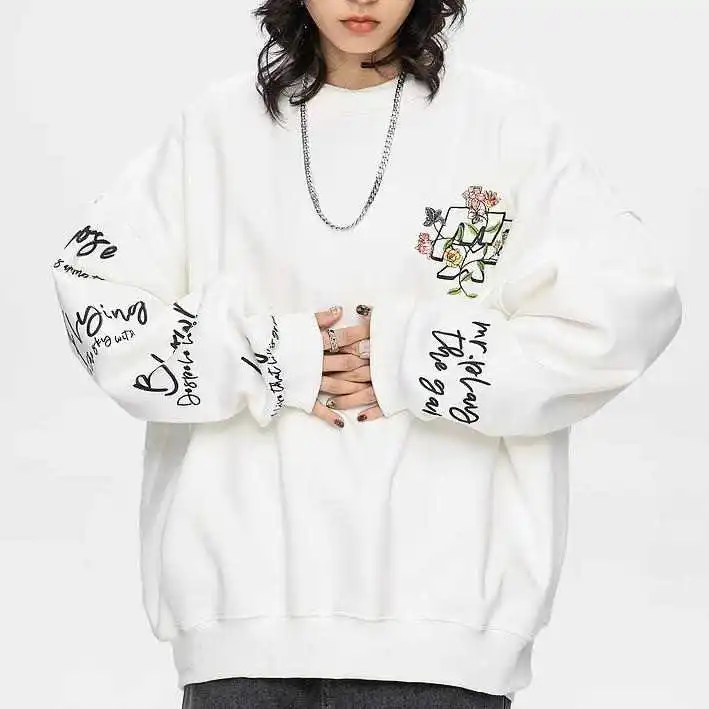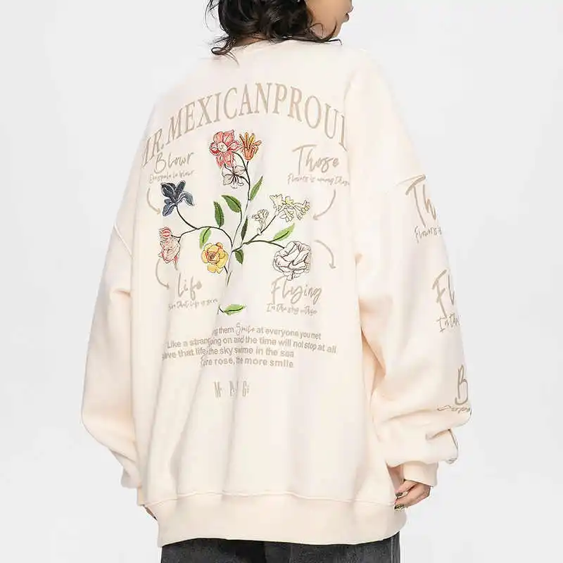 In the world of fashion, especially streetwear, embroidered sweatshirt mens styles have always been a staple. Combining comfort with creative, eye-catching designs, our embroidered crewneck sweatshirt represents the latest in trendsetting fashion. Featuring a bold combination of letter and floral embroidery on the left chest, print-embroidery fusion on the right sleeve, and back, this oversized sweatshirt offers an innovative twist on a timeless silhouette.